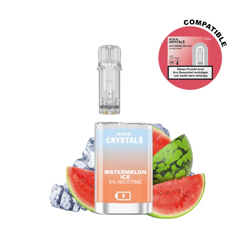 Dem Set liegt ein Crystal Pod Watermelon Ice mit einer Kapazität von 2ml bei, der den frischen, saftigen Geschmack von Wassermelone hat und mit einem Hauch von eisiger Kühle für ein äußerst erfrischendes Erlebnis sorgt.