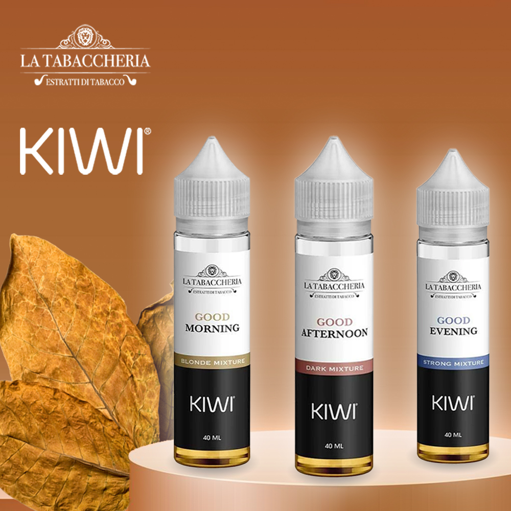KIWI Vapor, in partnership with La Tabaccheria, offers an exclusive range of 40 ml tobacco e-liquids, specially designed to satisfy fans of authentic, refined flavours. These e-liquids come in three editions, each designed to be enjoyed at different times of the day : Good Morning, Good Afternoon and Good Evening.